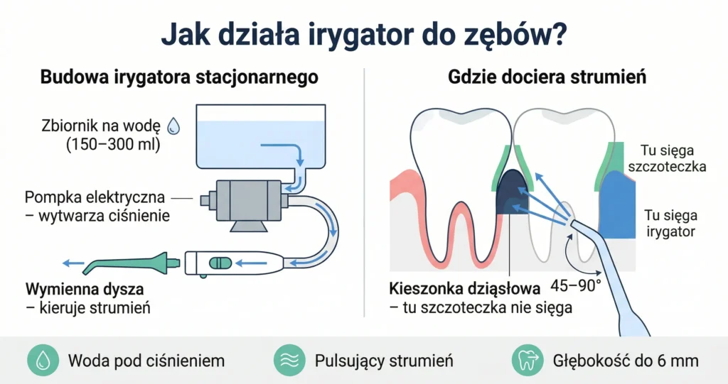 - Irygator oczyszcza jamę ustną pulsującym strumieniem wody pod ciśnieniem, docierając do przestrzeni między zębami i kieszonek dziąsłowych.