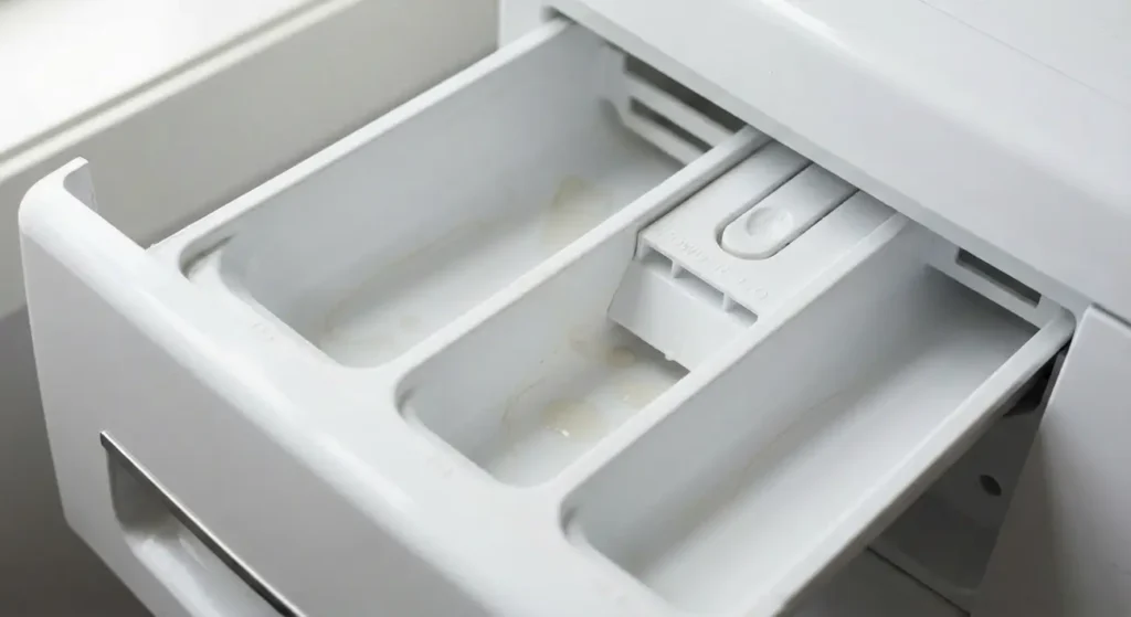 Szuflada na proszek i płyny to miejsce, w którym bardzo często gromadzą się resztki detergentów, pleśń i osady mydlane. Wyciągnij szufladę z pralki – w większości modeli wystarczy ją pociągnąć do oporu i nacisnąć znajdujący się w środku przycisk lub dźwignię.